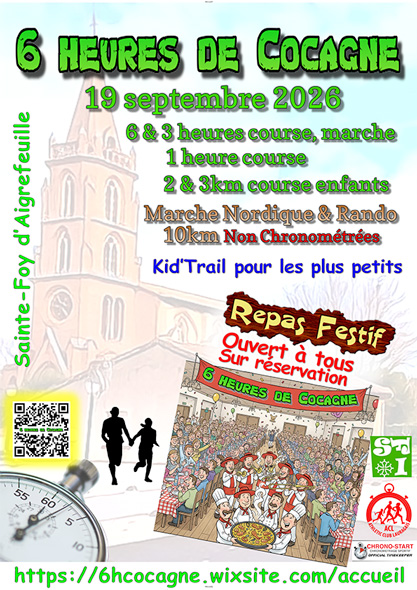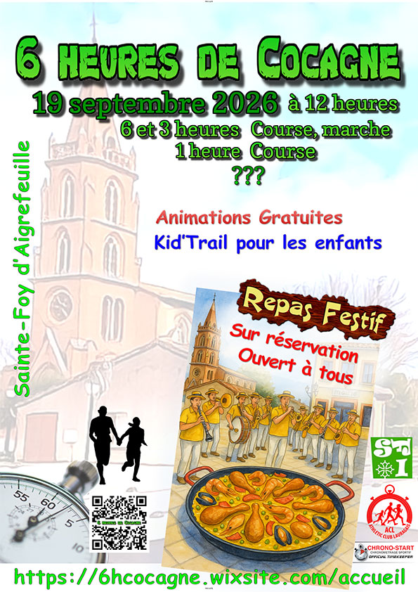 2ème édition des 6 heures de Cocagne aura lieu le samedi 19 septembre 2026 à la salle des fêtes de Sainte Foy d’Aigrefeuille, place François Mitterand. Elle sera organisée par l’Athlétic Club Lauragais et Sainte Foy Initiative avec le soutien de la Mairie.