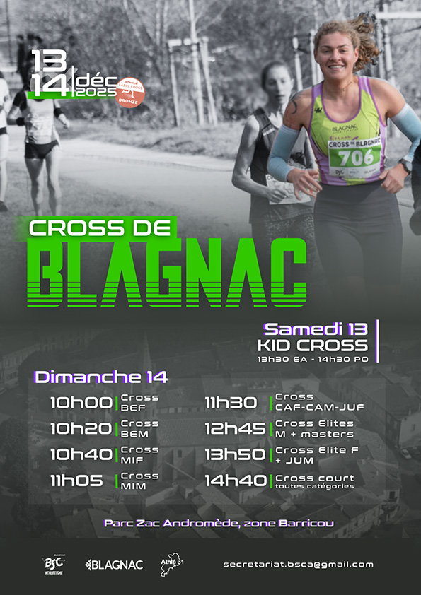 Le CROSS de BLAGNAC se déroulera le Samedi 13 Décembre pour le Kid Cross et le Dimanche 14 Décembre pour le Cross.