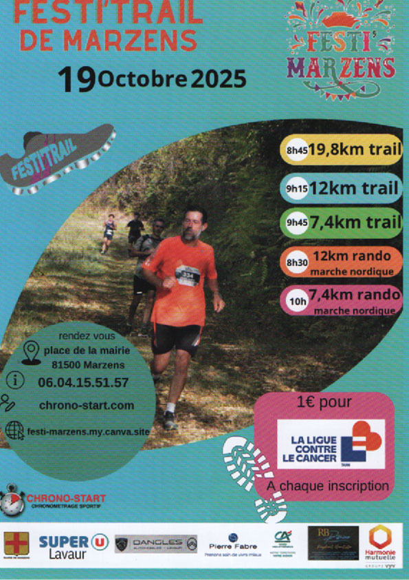 Les Trails et les Randonnées du FESTI’TRAIL, sont organisés par l’Association Festi’Marzens avec le soutien des communes traversées.