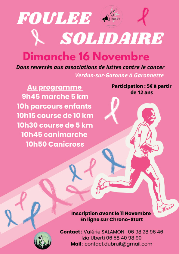 Foulée Solidaire est une manifestation caritative organisée par le comité des fêtes de Verdun sur Garonne « Du bruit » destinée à sensibiliser la population au dépistage précoce du cancer du sein et à la sensibilisation de la santé masculine.