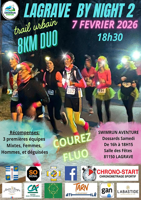 Avec la collaboration de la mairie de LAGRAVE, SWIMRUN AVENTURE organise la 2ème édition de la course en duo de LAGRAVE Le Samedi 7 février 2026 à 18H15 dont le départ se fera à LAGRAVE.