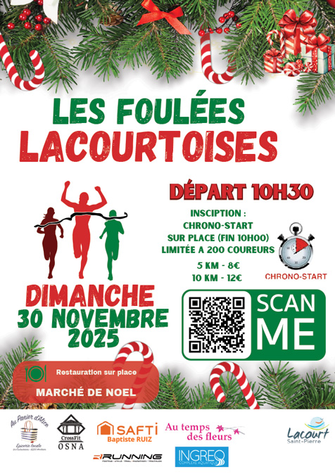 Le comité des fêtes de Lacourt-Saint-Pierre organise dans le cadre du marché de noël de Lacourt-Saint-Pierre le dimanche 30 novembre 2025 LES FOULÉES LACOURTOISES, avec le concours de la commune de Lacourt-Saint-Pierre, et de ses partenaires. La manifestation se décline en différentes courses à pied de 10 km et 5 km ainsi qu’une course enfant de 800m.