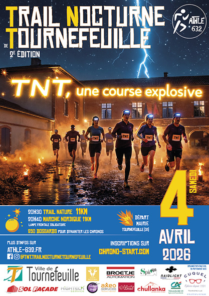 L’ATHLÉ 632 organise la 2ème édition du Trail Nocturne de Tournefeuille (TNT) le 4 avril 2026 avec le soutien de la Mairie de Tournefeuille.