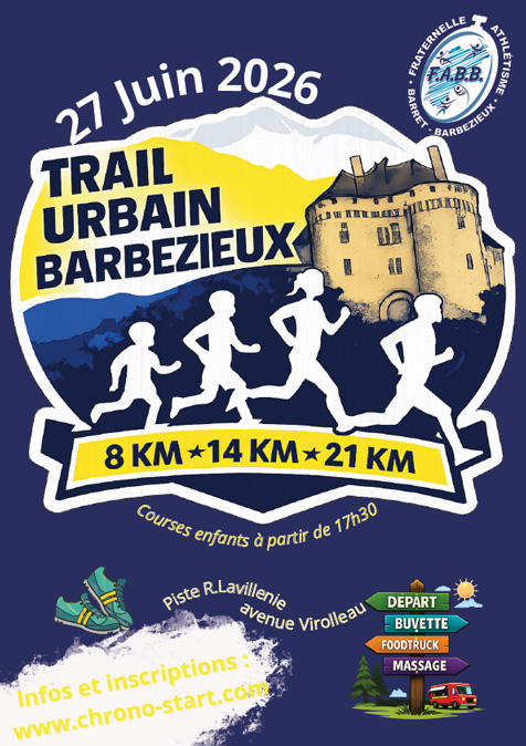 La Fraternelle Athlétisme Barret Barbezieux (FABB) organise son trail semi-urbain annuel le samedi 27 juin 2026. Au programme 3 épreuves chronométrées , au cœur de la ville et de la campagne sud charentaise. Départ du stade Gilbert Santiago et arrivée sur la piste d’athlétisme Renaud Lavillenie.